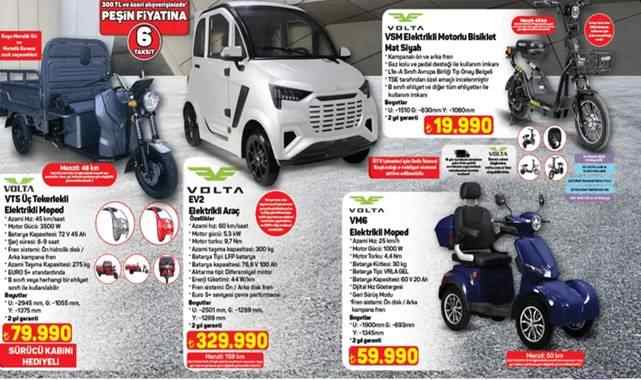 VOLTA EV2 elektrikli araç 329.990 TL, VOLTA VT5 Üç Tekerlekli Elektrikli Moped 79.990 TL, VOLTA VM6 Elektrikli Moped 59.990 TL ve VOLTA VSM Elektrikli Motorlu Bisiklet 19.990 TL fiyatlarıyla mobilite kategorisinde yer alıyor.Büyük Ekran Yeni Nesil TelevizyonlarSAMSUNG 70U8000F 70" UHD Smart TV 42.999 TL, SAMSUNG 50U8000F 50” 4K Ultra Smart LED TV 26.999 TL, ONVO 40VQ80F2FA 40” Frameless FHD Whale OS 10 QLED TV 9.599 TL fiyatlarıyla televizyon kategorisinde listelenirken, XIAOMI TV Box S 3. Nesil Medya Oynatıcı 3.999 TL fiyatıyla teknoloji ürünleri arasında bulunuyor.Uygun Fiyatlı Beyaz Eşya ModelleriFLAVEL FLV 3600 E Buzdolabı 18.999 TL, REGAL RGL 90 BT/BT 1001 / BT 901 Büro Tipi Buzdolabı 6.999 TL, SEG CM 911 INV Çamaşır Makinesi 15.999 TL ve FLAVEL Siyah Turbo Cam Ankastre Set 15.399 TL fiyatlarıyla satışa sunuluyor.Günlük Hayatı Kolaylaştıran ÜrünlerONVO OVTC01 Thermocooker Akıllı Mutfak Robotu 15.999 TL, ONVO OVTC02 Elektrikli Düdüklü Tencere 4.499 TL, KIWI KC-8203 Şarjlı Pratik Rondo 499 TL, SINBO SHB-3186 5 Fonksiyonlu El Blender Seti 1.599 TL ve PIERRE CARDIN Retro Kettle 1.299 TL fiyatlarıyla mutfak ürünleri arasında yer alıyor.