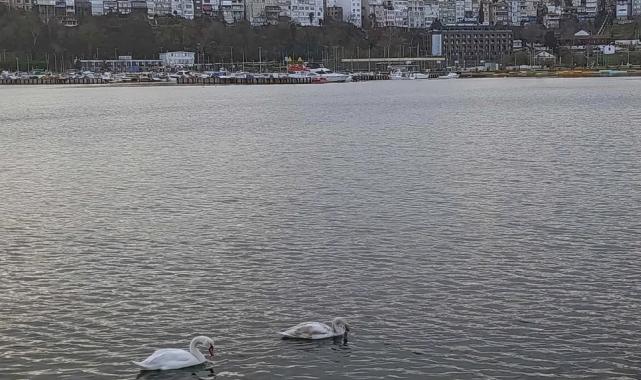 İstanbul'da Şile Limanı’na gelen iki kuğu, rüzgarsız havayı ve limandaki sakinliği fırsat bilerek huzur içinde gezindi. Nadir görülen anlar vatandaşların ilgisini çekti.