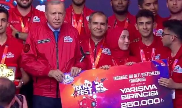 İSTANBUL (İGFA) - Sanayi ve Teknoloji Bakanlığı ile Türkiye Teknoloji Takımı (T3) Vakfı tarafından organize edilen Teknofest 2025’e, 81 il ve 96 ülkeden 565 bin takım ve 1 milyon 200 bin yarışmacı katıldı. Cumhurbaşkanı Recep Tayyip Erdoğan, 13’üncüsü düzenlenen Teknofest 2025 İstanbul’un açılışında yaptığı konuşmada, gençlerin coşkusunun kendisini umutlandırdığını belirtti. Cumhurbaşkanı Erdoğan, 64 farklı yarışmada finale kalan 13 bin yarışmacıyı kutlayarak, ödül kazanan takımların başarılarının devamını diledi. Jüri üyeleriyle titiz değerlendirmeleri için teşekkür eden Erdoğan, festivalin düzenlenmesinde emeği geçen Sanayi ve Teknoloji Bakanlığı, T3 Vakfı ve tüm paydaşlara teşekkür etti. Teknofest'in gençlerin teknoloji ve inovasyonla buluşmasının en güzel örneği olduğunu kaydeden Cumhurbaşkanı Erdoğan, "Bu coşku, Türkiye’nin geleceğine ışık tutuyor. Şunu bir defa öncelikle söylemek isterim. Buradaki atmosfer, siz gençlerimizin heyecanı, beni farklı bir ruh iklimine götürüyor" dedi. T3 Vakfı Başkanı ve Teknofest yönetimi adına Selçuk Bayraktar, Cumhurbaşkanı Erdoğan'a günün anısına plaket takdimi sonrasında, yönetici ve katılımcı bakanlarla birlikte Teknofest pozu verdi.